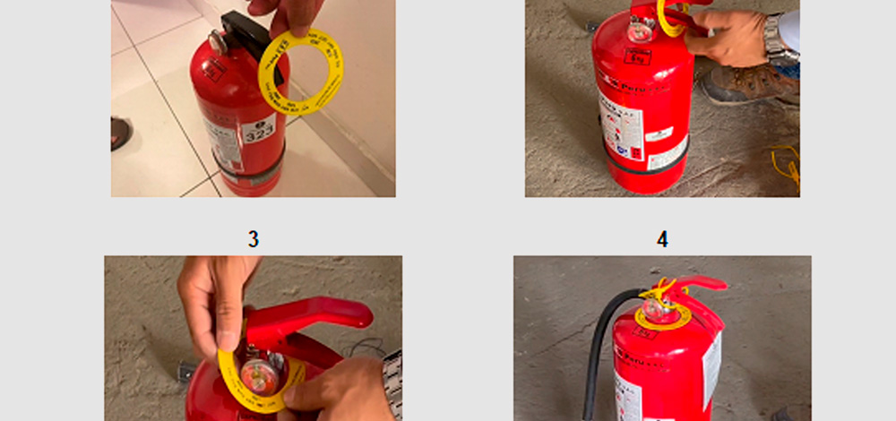 Un de los principales hallazgos realizados durante la inspección que realicé, fue el empleo, por parte de la empresa encargada de hacer el mantenimiento de los extintores, de un collar con dimensiones mayores a las permitidas por la Norma, la cual establece que dicho collar debe tener un diámetro del orifico interno que no permita ser removido si antes no es retirado el tubo sifón; una secuencia de fotos que a continuación se presenta permite apreciar que sin mayor esfuerzo el collar puede ser introducido a través del conjunto de la válvula y manija, sin retirar la válvula.